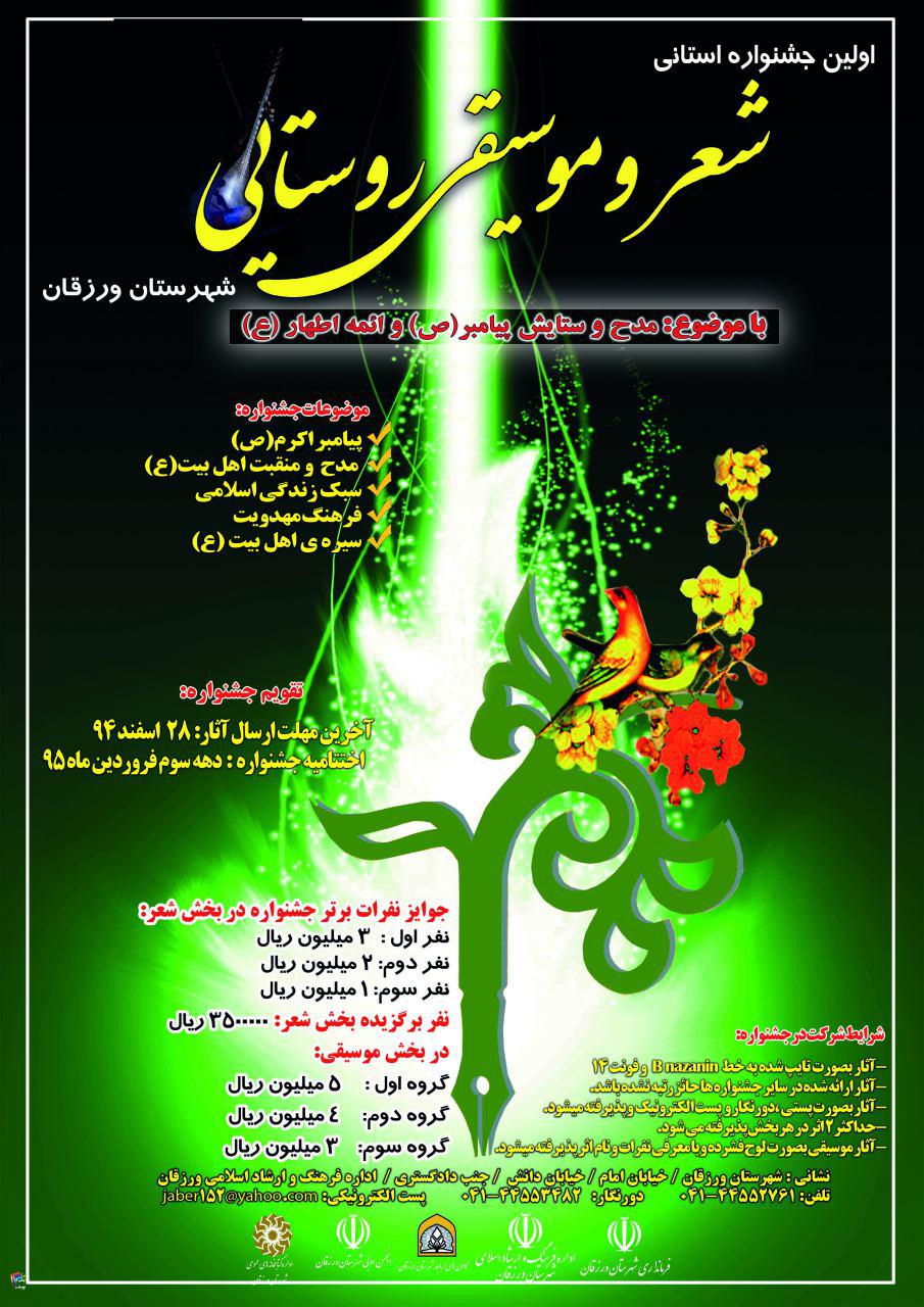 به گزارش آوای ورزقان، اولین جشنواره استانی شعر و موسیقی روستایی با موضوع پیامبر اکرم (ص)، مدح و منقبت اهل بیت و ائمه اطهار (ع)، سبک زندگی، فرهنگ مهدویت و سیره ی اهل بیت (ع) که توسط اداره فرهنگ و ارشاد اسلامی شهرستان ورزقان برگزار میشود تا ۲۰ فروردین امسال تمدید شد.