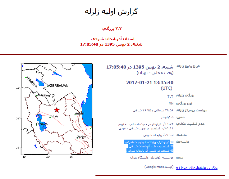 به گزارش آوای ورزقان؛ امروز شنبه، ۲ بهمن ۱۳۹۵ ساعت ۱۷:۰۵:۴۰ زلزلهای به بزرگی ۳٫۲ ریشتر و در فاصله ۱۰کیلومتری ورزقان،